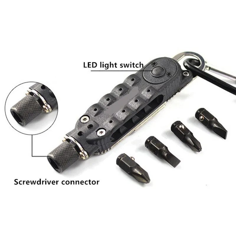 1.Small and large screwdrivers, large and small Phillips screwdrivers, LED lighting (white light), two kinds of hexagonal swinging hands, bottle opener, quick hook.